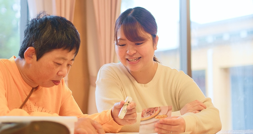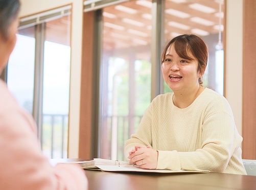 毎日の利用者さんとのあいさつや会話をできることが増えたり、毎日の声掛け1つ1つで伝えることが増えたりすることが嬉しく、やりがいになっています。物に拘りがある利用者さんを担当したとき、新しい物への受け入れがなかなか難しい方でしたが、一緒に買った物を居室に置けるようになったことや、外、内履きを買って履いて頂けたときの嬉しさは忘れられません。対人の難しさがあるなかでも、支援がうまくいったとき、チームでの連携や話し合ったことがいい流れになったり成功を重ねることで楽しみながら働くことが出来ています。