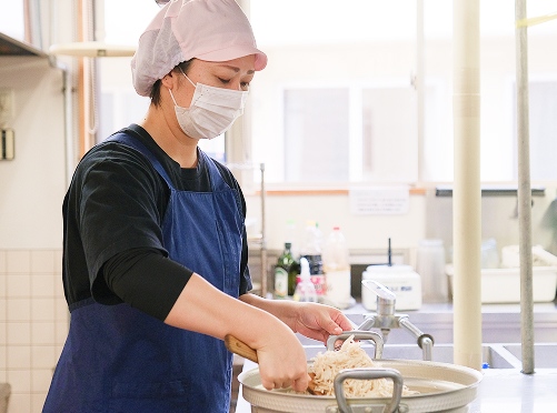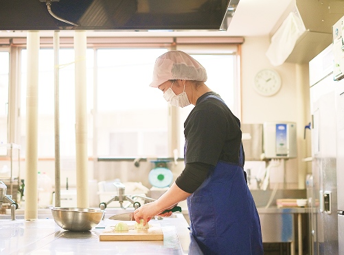 朝・昼・夕の食事づくりを担当し、利用者様の健康を食事面から支える仕事です。希望の献立や旬の食材を取り入れながら、日々の活力となる食事を提供します。また、個々の食形態(刻み・ミキサー食など)への対応や衛生管理、行事食の調理も行い、一人ひとりに合った安心でおいしい食事づくりを心がけています。