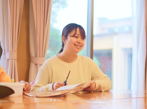 ゆかりの木では、先輩・上司問わずコミュニケーションが活発に行われ、気軽に相談しやすく、意見も言いやすい、風通しのいい環境が整っています。また、定期的な研修参加や資格取得に向けた支援など、職場全体で個々のスキルアップをサポートする体制が整っています。そして、シフト調整や休暇取得にも柔軟に対応し、ワークライフバランスも整っているため、無理なく自分らしく働くことができ、長く続けやすい環境です。仕事面でも、やってみたい企画等があれば、それについて話し合い、実現させることができるため、何事にも挑戦しやすいことも良いところの一つだと思います。